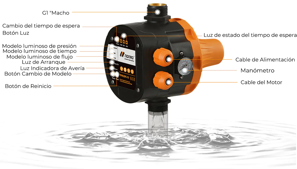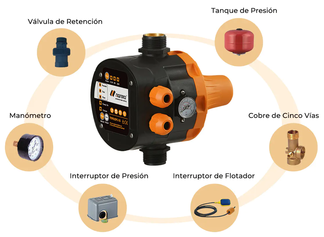 Este control digital arranca y para la bomba mediante un microcontrolador (MCU) según sea el caudal de agua o la presión. Reemplaza por completo el sistema tradicional de control de una bomba, compuesto por un depósito de presión, presostato, protección por falta de agua, válvula de retención, etc.